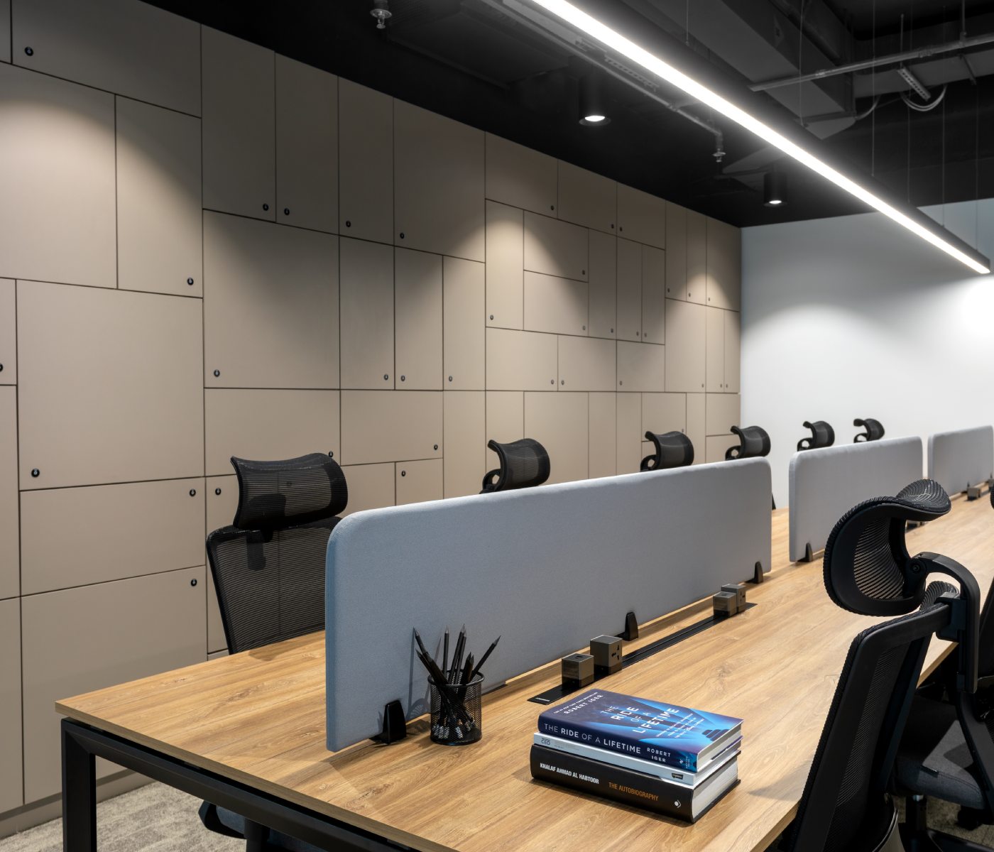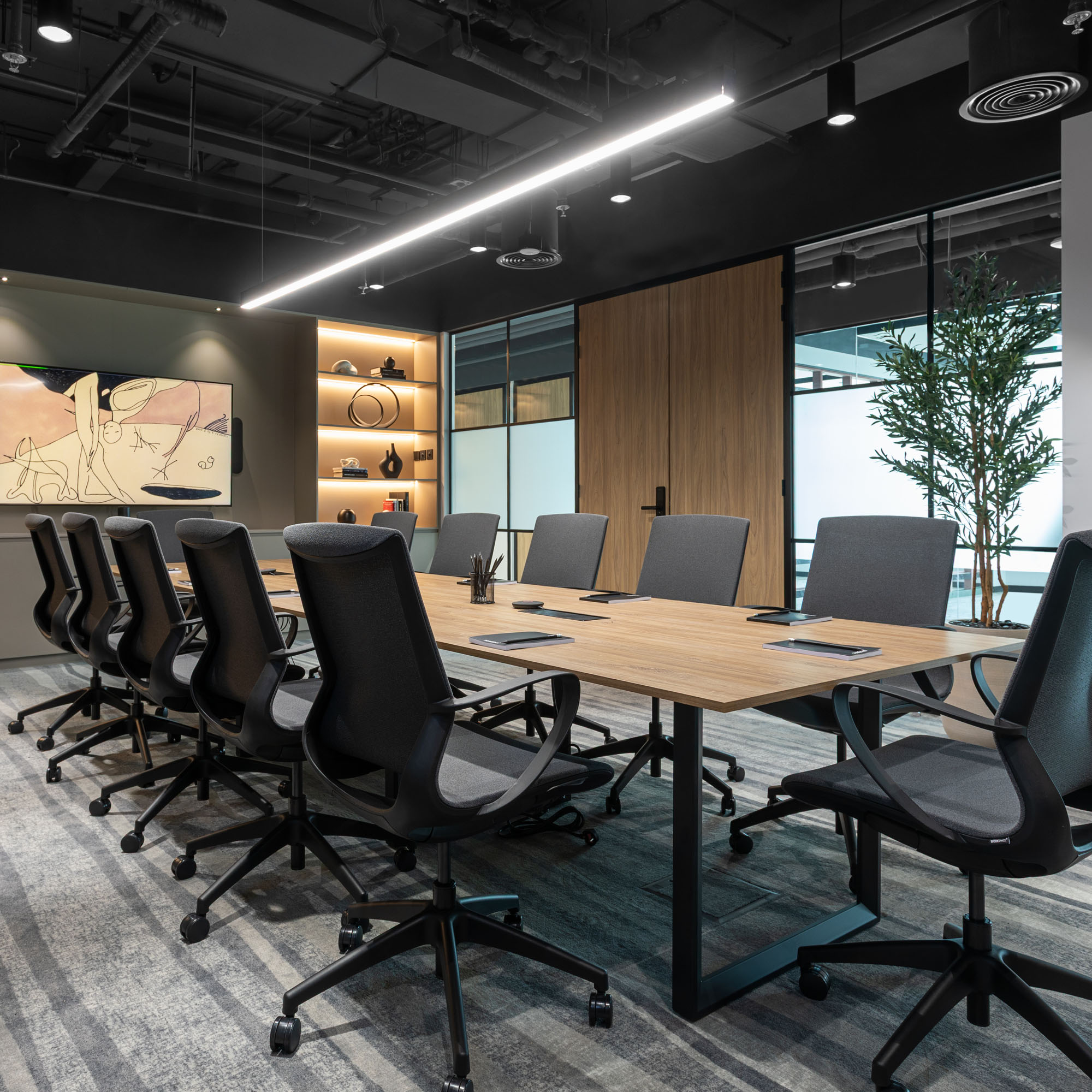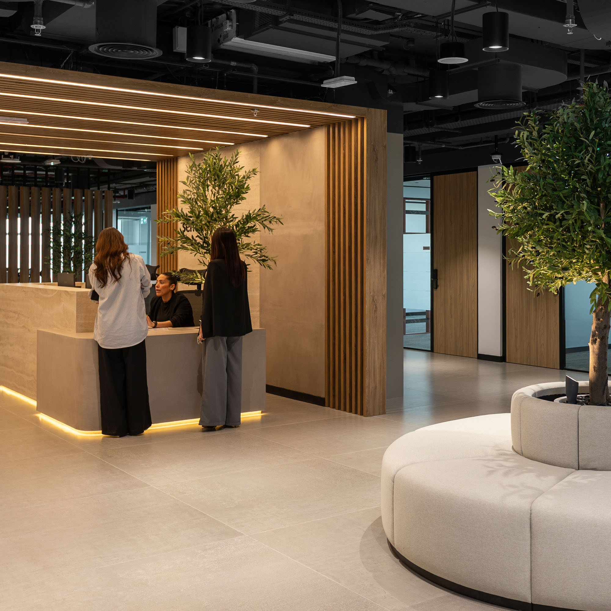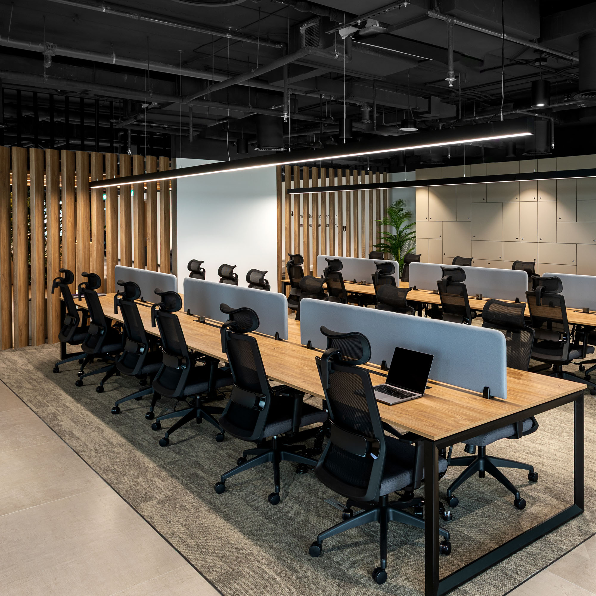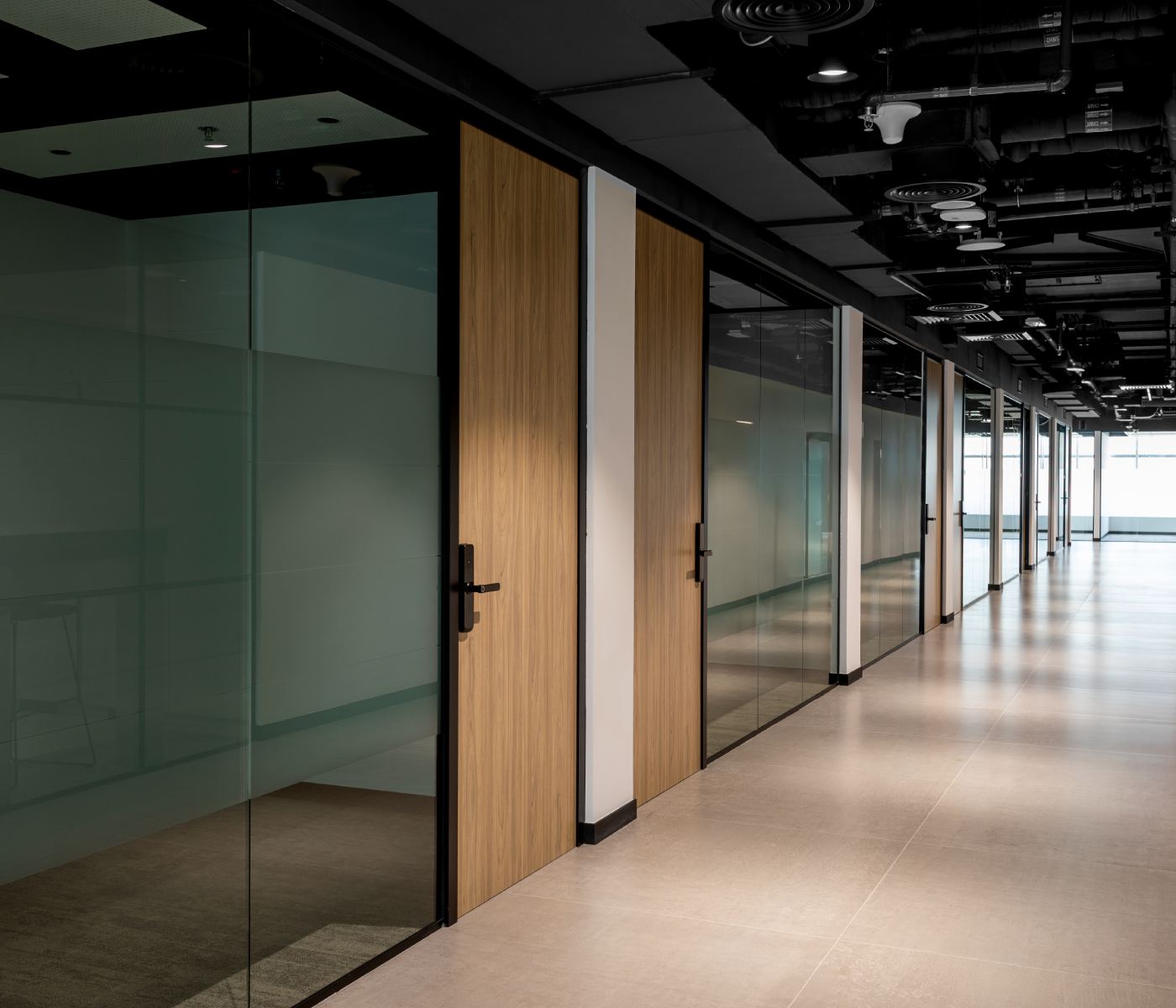 Perforated acoustic ceiling panels in the offices reduce echo and noise transmission